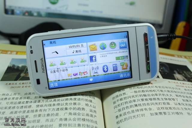 说完了系统,回归C6本身。先来看看手机的正面。绝对看到5800和5230的身影~3.2的电阻屏,但手机没有配手写笔。顶上左致右分别是光线感应器、听筒,副镜头、距离感应器(当接通电话时,如果挡住距离感应器的话,屏幕会变黑。也就是在你接电话时,屏幕会变黑,节约电)。