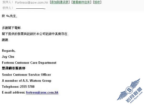 7月5日,托以前深圳公司的同事从香港丰泽买回一部5800,蓝色。价格在港币2830,所带配件:BL-5J锂电池(1320mAh),随机触控笔一支,CP-306触控琴拨电话绳,线控AD-54 HS-45免提耳筒,MU-43 8GB microSD存储卡,CP-305 手机套,CA-75U 影像输出线,高效能充电器AC-8X ,丰泽的发票。另外还送个一个电池和一个贴膜和一个充电器的转换器。按照网上的标准配置,我发现少了一个备用的触控笔和DT-29 电池充电座。可是因为是朋友去买的,也不好意思为了这点东西,再去追究了。7月6日朋友于深圳发顺丰给我,7月7日早上收到。收到货之后,按照平常程序去验机,没有发现什么问题。后来在论坛上看到有人说在香港买的行货,机器上和盒子上等都会有诺基亚的care标志贴,没有的话就都是水货等,于是才发现我的机器上和盒子上都没有所谓的care标志贴,连进网许可证都没有。8日,我给丰泽去了一封电邮。9日,也就是今天上午收到丰泽给的回邮。