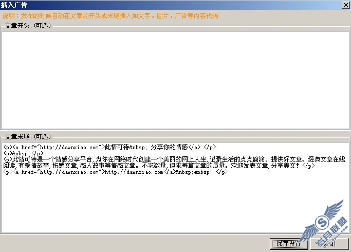再传几张图给大家看看工能, 功能很强悍,更多的自己看吧。可以设置文章头尾的广告内容,关键字连接等等