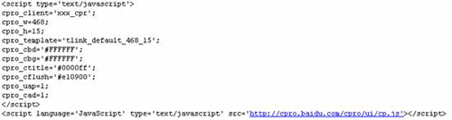 推广信息代码:投放到网页上的可请求广告的Javascript代码。当网站主登陆百度联盟,在“我的账户”—“您的广告代码”页面可以获得推广信息代码。将此代码投放到网页上即可请求推广信息。