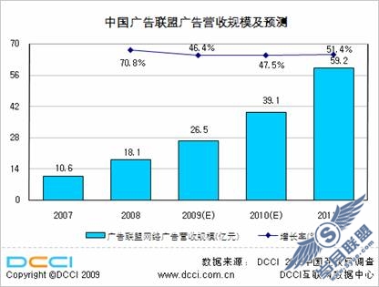 DCCI数据显示,2008年中国广告联盟市场规模达到18.1亿人民币,较2007年增长70.8%,广告联盟成为广告主投放网络广告的重要渠道之一,广告联盟在业内的影响力逐步增大。受金融风暴等多方面因素的影响,DCCI预计2009年中国广告联盟广告营收规模较2008年会增长46.4%,总规模增至26.5亿元人民币。