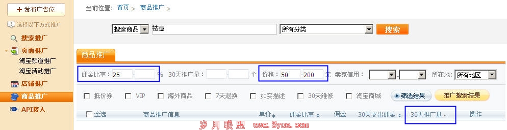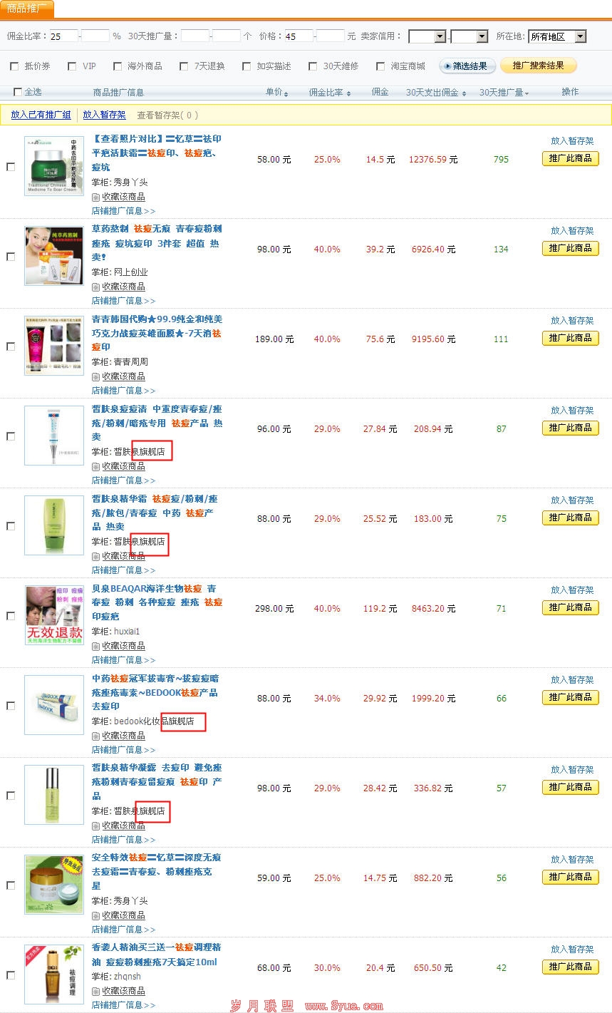 同时商城还有各类强制的消保措施等先天条件,所以推广的时间选择商城要比宣传普通C店好。目前淘宝商城的店铺有三类:旗舰店、专营店、专卖店 从掌柜的ID结尾即可看出来,同时在推广“祛痘”产品时候,筛选 25%佣金比率,价格45元以上,按照30天推广量排序,如下图所示 ,以红框标记的 “皙肤泉旗舰店” 和 “bedook化妆品旗舰店” 就是淘宝商城了。