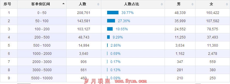 很明显 在 0-50 、 50-100、100-200 这3个区间里,成交的客户是最多的。所以我们在做淘宝客推广,单独选择推广主题进行细分推广的时候,主要选择50 - 200 元左右的产品,如果实在没有,可以降低到30元左右,再低的话,就不适合单独推广了,只适合做api站进行大批量推广。