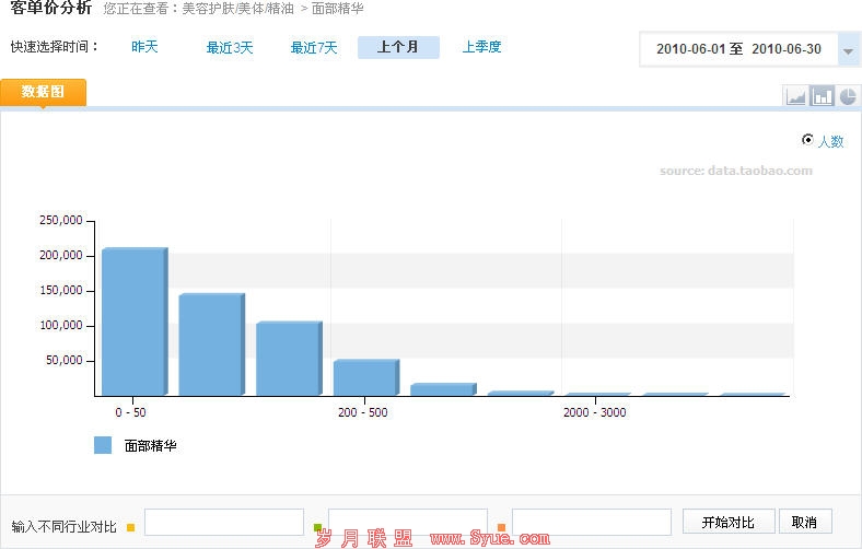 例如同一件产品“皙肤泉精华霜 祛痘祛痘印”在2010年5月和6月份这2个月里面,在“皙肤泉旗舰店” 和 “皙肤泉 普通C店”,各月分别的销量都是 1000件和2000件,但是显示出来的时候,“皙肤泉旗舰店” 显示的是3000件,而“皙肤泉 普通C店”显示的是 2000件。这个优势在后期愈加明显。