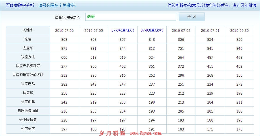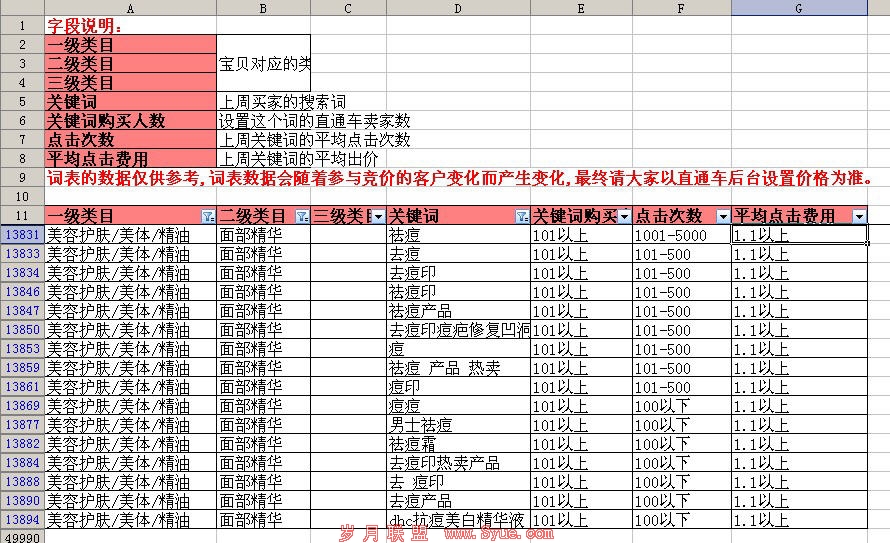 然后是淘宝的关键词表:2010-07-05 top5万 淘宝关键词 关于“祛痘”类的关键词,该表在 淘宝社区 数据类板块每周都有下载