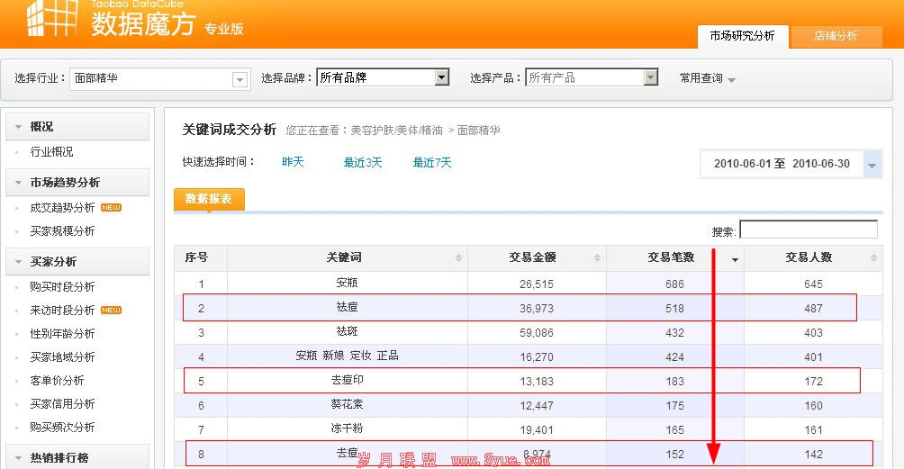 也许你会觉得这个词表不够权威,那么我们就拿 2010-06-01 —— 2010-06-30 淘宝数据魔方的数据来看看,按照交易笔数进行排序,我们可以发现,在 “面部精华”这一个二级分类里,交易笔数排行前8位的关键词成交中,“祛痘”占据了3位。