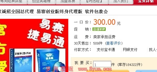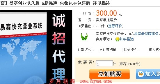 截图我也去店铺看过是真实的。冰蝶泪他截图给我的时候是30天销售781单,我去看的时候已经超过800单了。就按照这个截图销售数量来算他30天的销售业绩,是234300元。30天有23万4300元的销售业绩,冰蝶泪传我的图文说明中标明了利润,这个软件正在进行推广加盟的活动,标价是300元加盟,没有其他任何费用。300元是终身权限。每卖出一套,还可以返3级利润分别是195元 27元 18元,加起来就是240元的利润。卖一套就是240的收入,一共781单,上面淘宝店掌柜一月的收入是187440元。接近19万的月收入。按照日薪算是6248元。这些数字我看到后是震惊,像我这样天天上班拿高工资高待遇的工作,一个不起眼的淘宝店,他一个月拿到的钱接近我2年的工资。我感觉到了自己现在生活的无奈。人家奋斗一年,都比上我在单位混20年的正常收入。就算我以后待遇再加上去,打个对折,一个月相当于我奋斗1年。这样的事情对之前满足现状的我触动太深了。