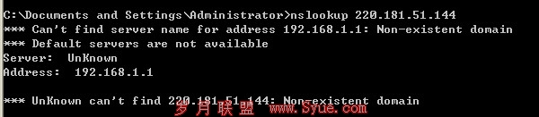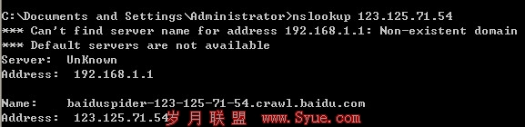 220.181.51.144 这个IP则是蜘蛛的IP,这里告诉大家一个鉴别真假百度蜘蛛的方法,我们电脑点击开始运行输入cmd打开命令提示符,输入nslookup空格加蜘蛛IP点击回车,一般真百度蜘蛛都有自己的服务器IP而假蜘蛛则没有。