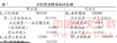 [例1]甲公司欠乙公司购货款35万元,由于甲公司财务发生困难,与乙公司协商以其生产的产品偿还债务,该产品公允价值20万元,实际成本12万元,甲公司为增值税一般纳税人,适用税率17%,乙公司收到甲公司抵债的产品作为库存商品入库,乙公司已对该项应收账款计提了5万元的坏账准备。会计处理见表1: