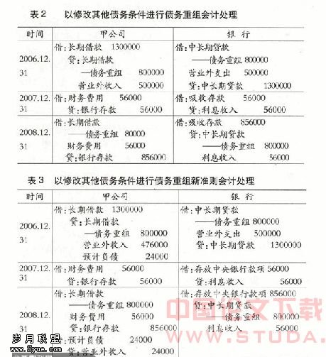 (1)或有应付金额不确认预计负债,处理见表2。对于甲公司,重组后长期借款的入账价值为80万元,并确认营业外收入50万元,对于银行,重组后贷款的入账价值为80万元,并确认营业外支出50万元。(2)或有应付金额确认预计负债,如前例,似设2008年甲公司盈利的概率为55%,会计处理见表3。本例涉及或有负债,应确认预计负债2.4万元(80x3%),由于甲公司2008年无盈利,故应将预计负债转入营业外收入。对于银行账务处理不变。
