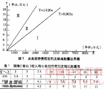 根据《实施条例》第43条规定:“企业发生的与生产经营活动有关的业务招待费支出,按照发生额的60%扣除,但最高不得超过当年销售(营业)收入的5%。”。假设企业全年销售(营业)收入为x,全年业务招待费的发生额为Y,则业务招待费税前列支的最大边界线为Y=0.005X,同时根据发生额的60%的扣除标准,可以得出业务招待费税前列支60%的最大边界线为Y=0.005X÷0.6=1/120 x,列函数表达式如下: