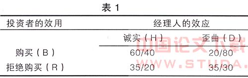 表1中的数字分别代表了投资者和经理人在各种不同的选择组合中的效用水平。投资者和经理人的信息是不对称的,所以双方都是在不知道对方作何种选择的情况下作出自己的战略选择的。