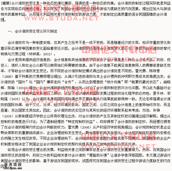 尽管我国的会计准则制定的历史较短,但到2007年已颁布实施了一项基本准则和38项具体准则,虽然我国和美国的会计环境不同,但有一点毋庸置疑,那就是:会计准则具有技术性。既然如此,在我国理应也存在着上市公司管理当局和其他利益相关方参与会计准则制定的游说行为。
