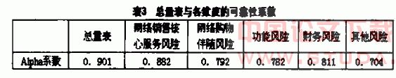 3.信度分析。信度分析的结果显示,各维度的 α 系数都在0.704 之上,而且总量表的α系数为0.901,表明最终形成的感知风险维度,信度颇佳。见表3。