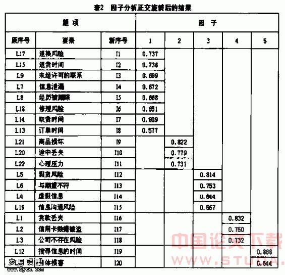 如表2所示,因子分析共提取了5个因子,累计解释了方差变动的68.27%。第一个因子基本上反映了“退换风险”、“退货时间”、“未经许可的联系”、“信息泄漏”、“经历被跟踪”、“修理风险”、“取货时间”、“订单时间”等八个要素,将其命名为“网络销售核心服务风险”维度;第二个因子基本上反映了“商品损坏”、 “途中丢失”、“心理压力”等,将其命名为“网络购物伴随风险”维度;第三个因子基本上反映了“假货风险”、“与期望不符”、 “虚假信息”、“信息沟通”,将其命名为“功能风险”维度;第四个因子基本上反映了“货款丢失”、“信用卡数据被盗”、“公司不存在风险”,将其命名为“财务风险”维度;第五个因子基本上反映了“搜寻信息的时间”、“身体损害”的风险,将其命名为“其他风险”维度。因此,通过因子分析后,得到消费者感知风险的5个维度。