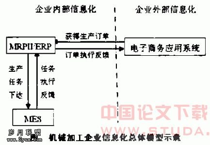 企业信息化是国家“863”计划的一个主题方向之一,政府给予了大力支持,并建立了许多示范性工程,取得了较好的经济效益和社会效益。企业信息化的内涵和外延也在不断丰富和发展,本人认为企业信息化应包括企业上层信息化(MRPII/ERP)、企业下层信息化(MES)和企业电子商务应用系统三个方面,具体关系见下图: