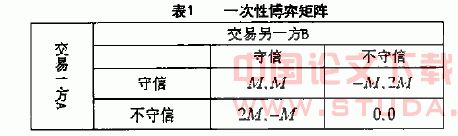 假设在的经济活动中,如果双方都守信,那么他们的收益各为M,如果只有一方守信,则守信一方的收益为-M,不守信一方的收益为2M;如果双方都不守信,则交易无法完成,双方收益为0。其博弈矩阵如表1。