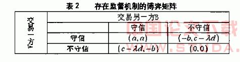 3.政府干预情况下的博弈分析。以上讨论的是在无政府干预情况下的交易双方行为的选择模型,交易人依据自身的收益最大化原则来选择守信或失信,是通过市场产生一种自发的信用机制。在有政府干预或监管的情况下,政府可以通过制定、法规并采取一定的措施,对交易中失信行为进行严厉的处罚,增加失信者的违约成本。这时,交易者就会视政府的监管力度的大小而相应的改变其行为的选择模式。下面构造了存在政府干预情况下信用博弈的模型,对商务中失信行为的外因环境进行分析。假设交易双方都守信的收益为a;一方守信而另一方不守信,则守信一方的损失为b,不守信一方的收益为c,被监管方发现惩罚的概率为λ,罚金为d,所以不守信的收益为c-λd;双方都不守信则交易无法完成,双方的收益均为0。其中c>a,P交易者A守信的概率为P。表2为监管机制下的博弈矩阵。