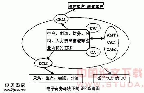 总之,未来ERP的方向和趋势是进一步和商务、客户关系管理、供应链管理等其他应用系统进行整合。ERP的管理范围有继续扩大的趋势,在经营业务方面主要是电子商务、客户关系管理、办公自动化(OA)等系统都将会不断地融人ERP系统中。此外,ERP系统还与CAD、CAM、CAP等系统融合,互相传递数据。在电子商务环境下的ERP系统的整合图,如图所示。