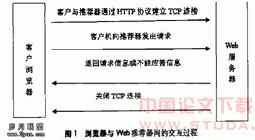 与传统的网站系统相比,个性化的电子商务系统有一个很大不同之处:个性化的电子商务网站一般都没有静态页面,这是由HTTP协议的“无状态性”所决定的。浏览器与Web推荐器之间的一个交互过程如图1所示。