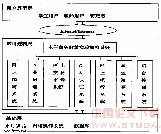 电子商务教学实验模拟系统应能够授课和网上实验相结合,满足课堂网络化教学的需要。能够满足学生实验的需要,通过上网实验而了解电子商务全过程的各个环节,掌握电子商务基本的理论知识和操作技能。能够基本满足学生进行模拟化的电子商务运行的组织与管理。能够让学生进行联机作业练习。能够对学生进行及成绩管理。针对以上目标,提出电子商务教学实验模拟系统的体系结构如图所示。