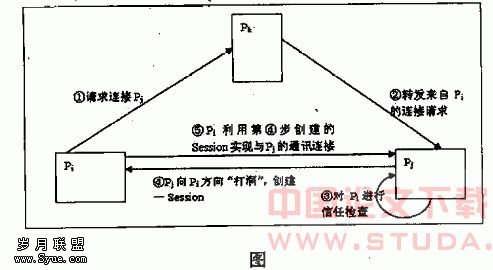 如图所示,Pi请求连接Pj的过程分为如下步骤:①Pi向Pk发出连接Pj的请求;②Pk利用其自身的发现机制搜寻到Pj,并将Pi的连接请求转发给Pj;③Pj利用其自身的信任检查机制对Pi进行信任检查,若通过检查,则进行下一步,否则拒绝Pi的联接请求;④基于P2P机制原理,Pj向Pi方向“打洞”,创建一Session;⑤Pi利用第④步创建的Session实现与Pj的通讯连接,至此,由Pi发起至Pj的联接成功完成。