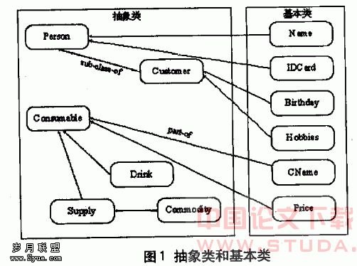 输入输出建模。收集基本类属性,消除其中的同名异义和异名同义现象;构建抽象类,从Customer的各种属性构建Customer类,根据已有的Commodity,Drink来构建Commodity,Drink类,考虑到Commodity和Drink都属于可消费品,建立一个更抽象的类Consumable,如图1所示。