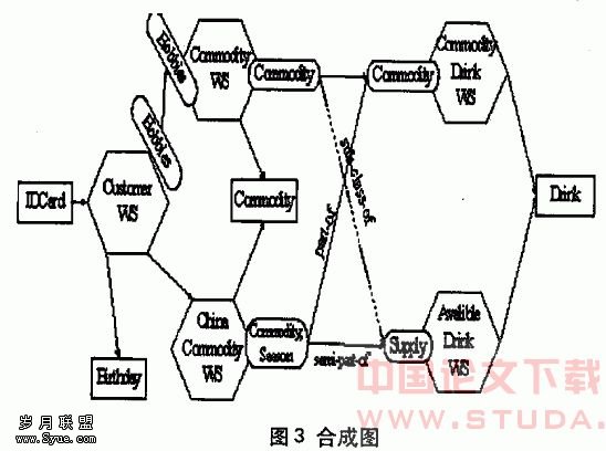 根据前面所阐述的建模方法,针对本案例有本体建模表示图2,其中六边形表示由Web服务转化的属性,它与类的连接表示属性的定义域、值域,也就是Web服务的输入输出。图3描述了饮料公司查询顾客信息时可能的Web服务接口的合成,六边形表示候选的Web服务,其上的圆角矩形表示其输入或输出类型。