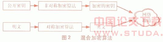 加密技术是电子商务安全的基础,对称加密算法与非对称加密算法(如应用最广泛的DES、RSA、MD5几种加密算法)各有优缺点,通常结合起来使用(即日益广泛使用的混合密码体制),以期同时获得公钥加密体制的安全优点和私钥加密体制的速度优势。混合加密算法工作原理如图2所示: