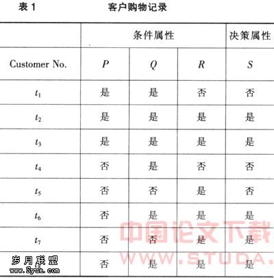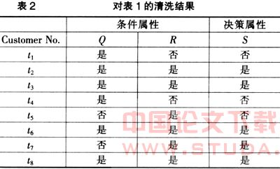 利用粗糙集的约简算法对数据进行清洗。主要是计算知识的约简、核、上近似及下近似(正域)。以决策规则为例。表1是某电子商店的购物记录, P,Q,R,S代表4种商品;Customer No. 为客户号。是:表示购买了某商品;否:表示没有购买某商品。