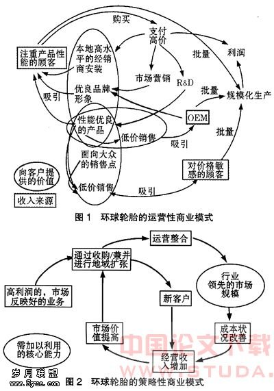 运营性商业模式创造的核心优势能力关系和知识,策略性商业模式对其加以扩展和利用环球轮胎公司采取了如图2所示的策略性商业模式,它将公司所达到的生产规模——行业领先的生产规模加以发挥和利用,通过增加生产规模和降低成本来做文章