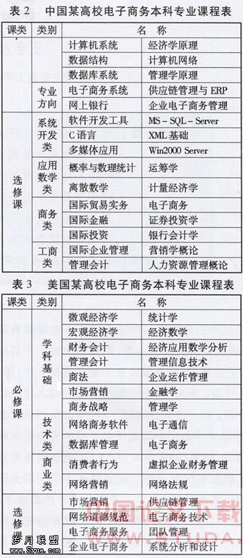 和美国对课程的组织都分为学科基础课和专业方向课。从学科基础课的内容上看,这两个国家都属于“加法的”课程组织结构和“抽样的”课程组织结构,即认为商务是管理、、技术等学科的综合。因此,在学科基础中选择了与之相关的基础课程,但是没有提供各个分支领域的深层次的课程,因此缺乏各门学科自身的逻辑性和完整性。从专业课的内容上看,中国属于“关联的”课程组织结构,采取的是融合形式,把不同的学科合并或融合为一门新的课程。例如,我们把管与信息系统论融合为电子商务系统建设与管理,把机技术和学融合为网上支付与电子银行等。而美国属于“整体的”课程组织结构,采用的是相关形式,强调在电子商务环境下传统理论的新应用。比如,环境下的营销、网络商务软件等。