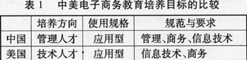 一般而言,中国高校对电子商务本科专业的培养方向就是培养从事商务管理,掌握电子商务相关信息技术的高级复合型专门人才_2_。而美国就其培养目标来说是培养商务环境下信息技术的应用人才。中美两国电子商务专业的培养目标的描述可以用一个二维表的形式表现(如表1所示)。