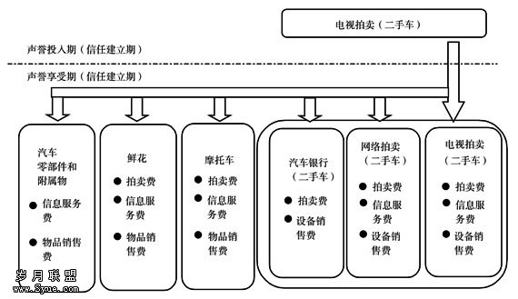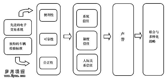 在网络条件下,信任不是一个静态的而是一个动态的现象。因此,必须将信任的管理动 态化。AUCNET 对信任的动态管理实际上是围绕“声誉链”的管理与维护来进行的。AUCNET的“声誉链”开始于二手车的电视拍卖,并且从时间(从1985年开始)和空间上(现场二手 车拍卖市场、二手摩托车市场和鲜花市场)向外延伸。对“声誉链”的管理过程实际上是信 任战略的一个重要的组成部分。“声誉链”延伸的结果是,更好地发挥和保持自己的竞争优 势,实现了联合与多样化经营。如果我们把AUCNET的“声誉链”与营运模式整合联在一起的 话,我们可以把它表示为图1。