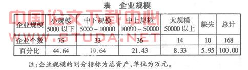 2.企业规模描述。规模的划分是一个相对的概念,按总资产数将企业分为4类(即:小规模、中下规模、中上规模、大规模)。从上表看,总资产5000万元以下的小企业所占比例最多为44.46%;资产在5000万元到1个亿的企业所占比例为19.64%;1到5个亿的企业所占比例为21.43%;资产为5个亿以上的大规模企业所占比例为8.33%。