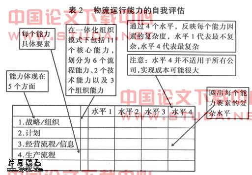这个研究是对物流框架的进一步发展。通常情况下追求高水平的物流能力代表积极的一个方面,上述的主要能力也是发展物流所具备的特征,这些能力是基准。但是,在少数情况下构成这些能力之一的技术并非是必要的、且与公司物流战略和整体战略相一致的资源。比如,如果战略目标是在结构相对不复杂的企业中实现最小成本,通过机系统实现组织、功能间的一体化,则显得较为昂贵。但是,对于一些行业如汽车制造来说,成本尽管是竞争性因素,但不是决定战略的唯一因素。在更为复杂的战略目标下,有效的物流管理是关键战略因素,而且建立一体化物流系统也是合理目标。我们所分析的框架(见图2)是评估一个组织物流能力的有效工具,它为物流改进和发展提供了基础,但是要与公司的整体战略和物流战略相适应。