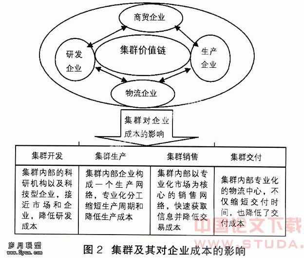 企业价值链活动。可以经过学习的过程提高作业效率从而使成本下降。弗里曼(1991)认为。集群内部存在知识溢出效应,该效应的存在是促进集群创新发展和集群经济增长的最根本动力是集群创新产出和生产率提高的源泉。产业集群完整的价值链促进了竞争者、供应商、顾客之间的信息流动和知识溢出,能够应对快速变迁的技术和市场,为企业开发新产品创造了良好的环境。