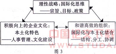 在企业发展的进程中,将国际化战略与本土化手段结合起来,融合两者的各自优势,发挥各自在不同领域的作用(如图3)。在制定企业的宗旨、目标和政策上具有国际化思维,在企业组织的结构、分工和协调上将国际化与本土化相结合思考,在企业文化上具有本土化特色。麦当劳公司就成功地结合了两者。