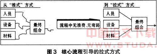 在有些车间,部件的生产都承载在生产流水线上,甚至在一个工段上,最后一个操作者也看不到第一个操作者在干什么。为了不至于让生产在这种脆弱的生产线中发生中断,又不得不在许多工序设置一些缓存库存,造成了对生产空间的浪费。相对于过去的推式生产中,前一作业将零件生产出来“推给”后一作业加工,在拉式生产中,是后一作业根据需要加工多少产品,要求前一作业制造正好需要的零件。而核心流程可以引导整个工作流的骨干,并且通过在流程中的无浪费、无弯路、无改变、无缺陷制度化地把整个工作流程贯穿起来。最后通过“拉式”方式来解决流程中的浪费以及弯路问题,从而形成生产中的最精益模式。
