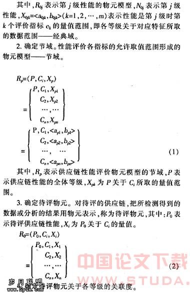 肖智等运用物元模型对研究企业竞争力做了综合评价,此方法是以事物、特征及事物关于该特征量值三者所组成的三元组,能够直观反映综合评价的质与量的内容关系,采用关联函数进行定量,使得综合评价简单易行。本研究准备建立供应链性能评价物元模型,对供应链性能的评价方法将是重大改进。