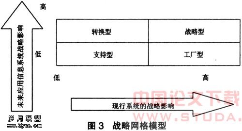 (4) 战略型:属双高型,表明企业需要从战略层次通过采用信息技术对信息系统进行持续改进,直到信息系统能够具备高级管理功能,换句话讲,企业的现在和将来都将离不开信息系统的支持。