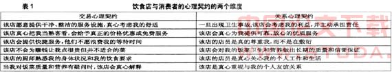 心理契约是一个复杂的心理结构,具有主观性、个体性、动态性和社会性的特点,且受个人、组织、、和文化因素的影响。Rousseau认为,在总体层次上,可以把心理契约分为交易心理契约与关系心理契约两大类,她通过对224位就业的MBA 毕业生的研究,得到了对交易心理契约与关系心理契约二维度区分的实证支持。交易心理契约与关系心理契约这两个维度的观点被广泛应用。一般来说,交易心理契约主要关注具体的、短期的和经济的交互关系,它是指某一有限时期内的具体的可货币化的交换。相对而言,关系心理契约更多地体现为隐含和主观的理解,关注广泛的、长期的、社会情感的交互关系,它除了经济方面的物质回报之外,还有来自较高卷入水平的情感投入,如对个人的支持、家庭的关注等无形因素,它能产生较强的参与情感和归属感。对于大多数个体来说,两种心理契约可能同时存在,只是所占比例不同。消费者与企业的心理契约也可以从这两个维度来分析。本文以消费者与某饮食店的心理契约为例来进行说明,见表1。