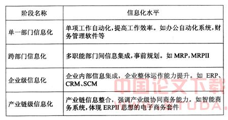 美国哈佛大学教授里查德·诺兰(Richard.Norlan)首先提出了信息系统发展的4个阶段,即开发期、普及期、控制期和成熟期,这是按时间顺序建立的四阶段模型。到20世纪80年代后期,信息系统的用途不断扩大,此时诺兰又提出了六阶段模型。即初始期、普及期、控制期、整合期、数据管理期和成熟期。这样诺兰模型已成为说明企业信息化发展程度的有力工具,是一个比较成功的模型,它在概念层次上对企业进行信息系统总体规划,对信息化的计划制定过程和衡量企业处于哪一个信息化发展阶段等方面提供重要。但是随着信息时代的发展,人们发现诺兰模型有其局限性,不能只是从机技术发展和人们接受使用计算机的水平来评价管理信息系统进程,而要从信息资源的有效配置、数据有效管理、系统有效集成,甚至还要从具体企业的信息化实施过程出发,所以就出现了业界普遍认可的企业信息化四阶段模型,这四阶段分别是:单一部门信息化,跨部门信息化,企业级信息化,产业链级信息化。如下表: