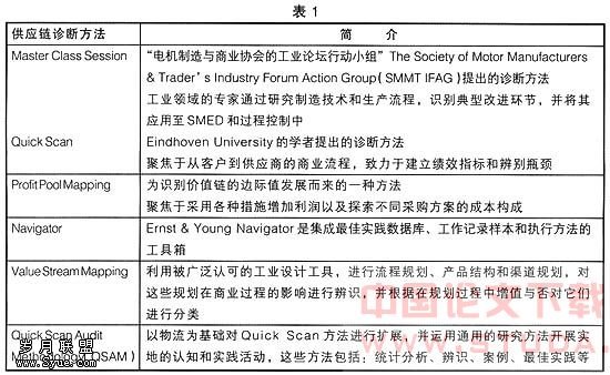 Christopher曾特别倡导把供应链的运作管理看作把握现实机遇,并籍此进行流程再造和提高生产力的有效手段。而为了在供应链的运作管理过程中,挖掘提高绩效的潜力,加强供应链的整体竞争能力,诸多学者曾提出过不少供应链诊断的方法,如表1所示。其中,Master Class Session,Profit Pool Mapping,Navigator及Value Stream Mapping等早期的供应链诊断技术与方法,在绩效评估、流程再造等方面见解独到并且行之有效。但是,它们都不能作为一种独立、系统化的供应链诊断方法而加以应用。因此,研究者们构造和发展了基于Quick Scan方法的系统化的供应链诊断方法。