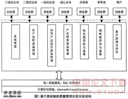 基于供应链的质量管理信息系统应面向产品的全部生产过程和销售过程,实现对产品设计质量、生产质量和使用质量的全面控制与管理,保证整个供应链上所有成员间的信息集成和过程的集成,从而实现企业间共同协作控制产品质量的目的。该系统以核心企业为中心,由核心企业负责系统的建立、维护管理,核心企业、各级供应商、分销商、零售商和用户都可以通过浏览器访问该系统,系统提供面向产品全部生产过程各个阶段和各层次的质量管理的信息化支持,实现供应链所有成员的数据同步,达到真正的全员参与共同保证最终产品质量的目标。为了实现系统设计的总体目标,系统采用Internet、Intranet和Extranet相结合的方式,实现互联网、企业内网和企业间互连网的合理信息共享,以SQL server 2000作为数据库系统实现数据信息的存储,通讯连接通过TCP/IP通讯协议,运用浏览器实现信息的录入与查询(如图1所示)。