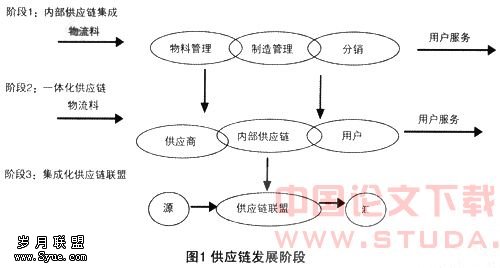 供应链在完成内部供应链集成、一体化供应链的阶段后,逐步进入了集成化供应链联盟阶段。集成化供应链动态联盟是通过实时信息的共享,应用信息技术实现集成。通过对生产经营过程的物料流、管理过程的信息流和决策过程的决策流进行有效地控制和协调,将企业内部的供应链与企业外部的供应链有机地集成起来进行管理,达到全局动态最优目标,以适应在新的竞争环境下高质量、高柔性和低成本的要求,是供应链管理发展的必然趋势。供应链各个发展阶段,如图1所示。