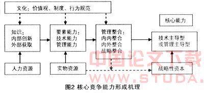 企业之间竞争的加剧使得核心能力的建设和培养倍受关注。核心能力是企业发展过程中长期积累起来不同于其他企业的、能够在企业为顾客创造价值过程之中起到特殊贡献的能力,是企业可持续竞争优势与新业务发展的源泉,具有高价值性、可扩展性和难模仿性。公司的真正竞争力是来源于能够比竞争对手以更低成本、更快速度建立起核心能力的能力,企业只有具备核心能力、核心产品和市场导向的层次结构时,才能在全球的竞争中取得持久的领先地位,其形成的过程如图2所示。