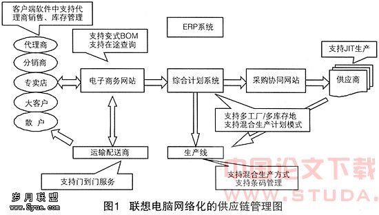 图1为联想电脑网络化的供应链管理图。联想通过网络化的供应链管理和ERP使得企业的竞争力得到了提高。库存周转速度提高;积压损失率降低;应收账周转期缩短;应收账坏账率、办公用品费用大幅降低。可见,供应链协作扩大了企业间的合作范围,实现了资源的高效配置,使得资源在供应链中形成良性流动,降低了总成本,进而提升了企业的竞争力。