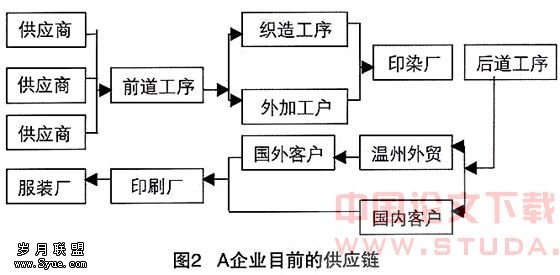 这一部分主要利用企业的供应链管理中的业务外包的思想,通过外包A企业的织造工序来达到降低A企业的生产成本和提高A企业产品质量的目的,A企业目前的供应链如图2所示。