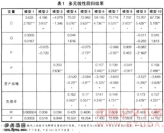 回归计量结果。在实际回归分析中,本文的回归结果如表1所示,共有十个模型,在没有控制变量的情况下,回归方程的拟合度都很低,在控制了企业规模、财务杠杆后,表现出较高的拟合度。一般认为,法人股具有正相关性。本文的结果显示了法人股在加上控制变量时表现出显著的负相关性。这反映出我国法人股由于其不是自发演化形成从而表现出与传统理论的相悖性, 验证了我们上文提出的强制所形成的股权比例只是一个形式,不对公司治理产生实质性的影响。普通股显示出了显著的正相关性,这说明在近似完全竞争的行业中,普通股对于降低管理层的代理成本,完善公司治理结构还是很有效的。